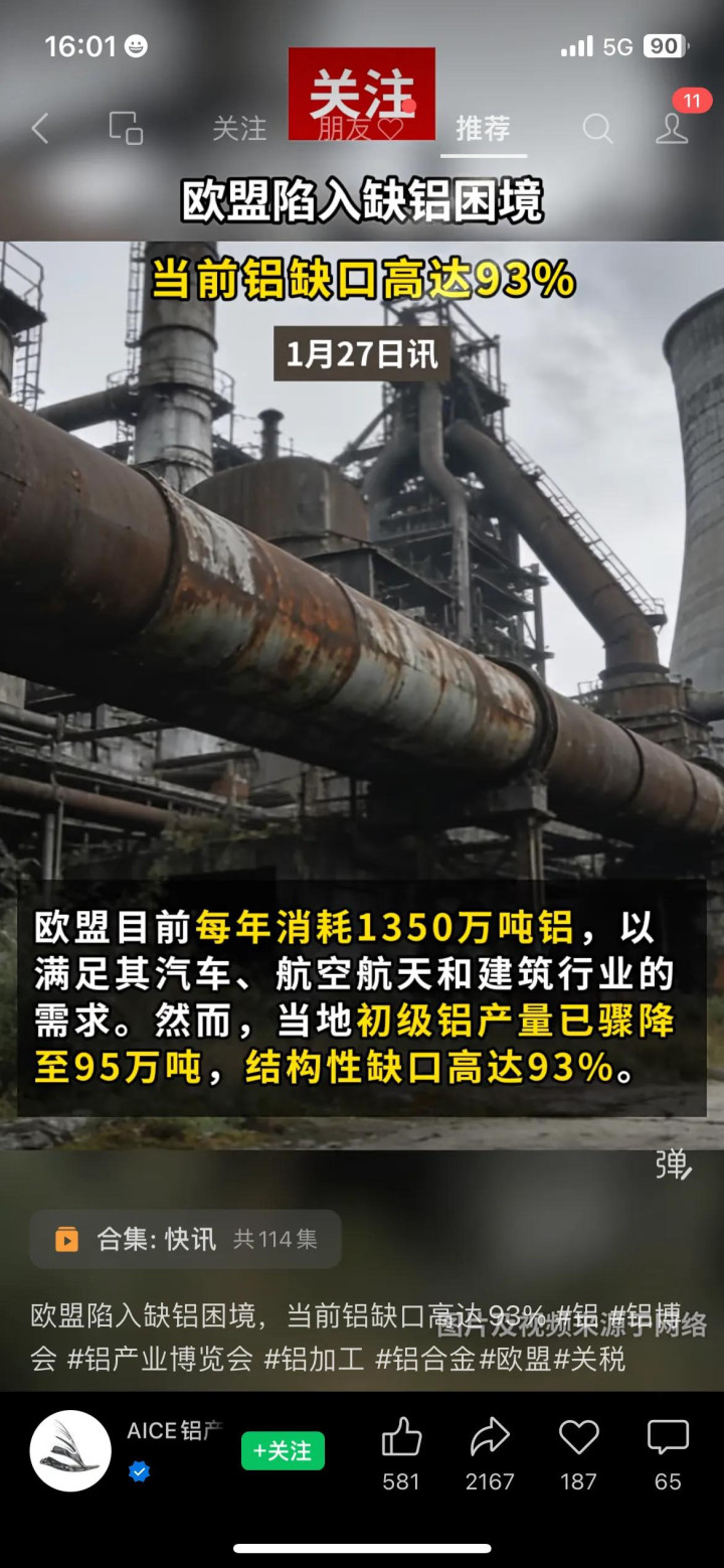 很多人觉得欧盟缺铝只是因为能源价格高,实则背后还有环保政策和地缘政治的双重影响。欧盟的环保政策对铝厂的排放要求极高,很多老铝厂达不到标准,只能关停,而新铝厂的建设周期长、投入大,短期内无法投产;再加上地缘政治的影响,欧盟对部分国家的铝进口进行限制,进一步加剧了铝缺口。这意味着,欧盟的铝缺口不是短期能补上的,至少未来3-5年,都将处于缺铝的状态。