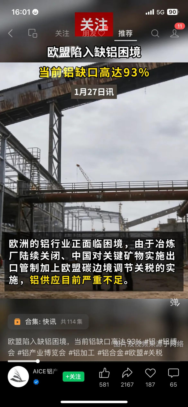 而欧盟缺铝,并不是短期的产能问题,而是产业链布局的硬伤。铝的生产需要大量的电力,电解铝更是“电老虎”,一吨电解铝需要消耗1.3万度电,而欧盟近年来能源价格暴涨,电力成本比中国高3倍,本土的铝厂要么减产,要么直接停产,很多铝厂甚至搬到了能源成本更低的国家。我身边做铝加工的邻居说,他的欧洲客户原本有自己的合作铝厂,现在都倒闭了,只能转头来中国找货源。